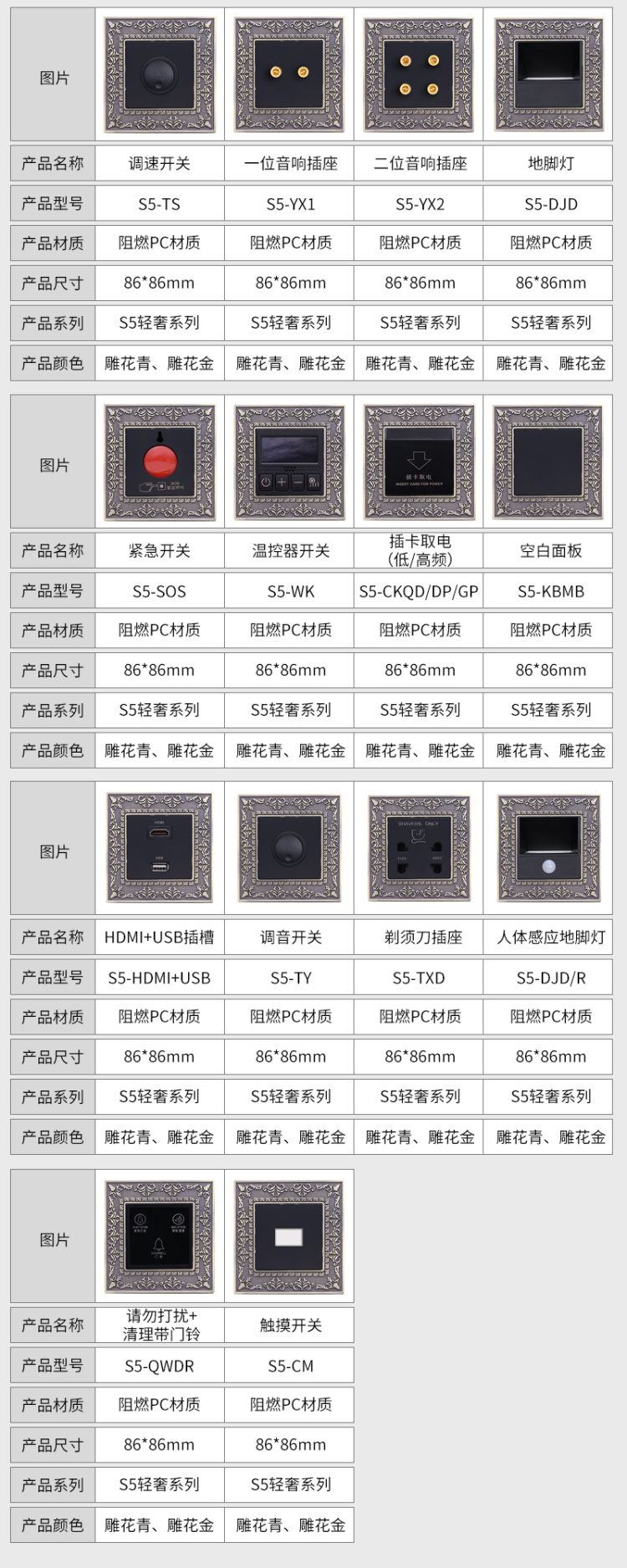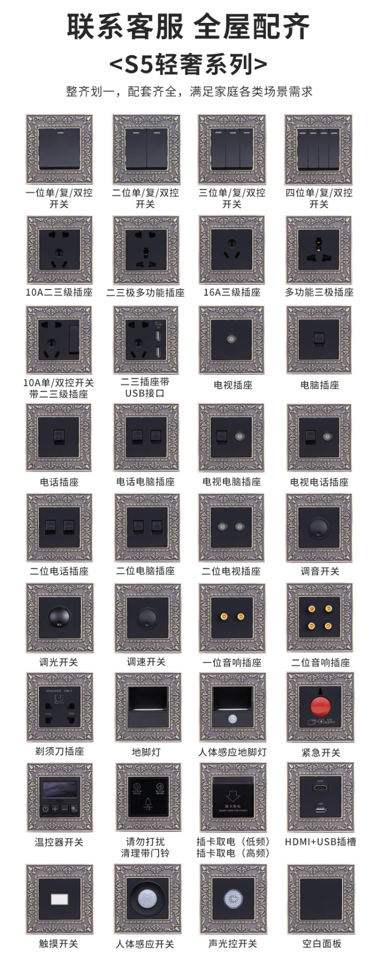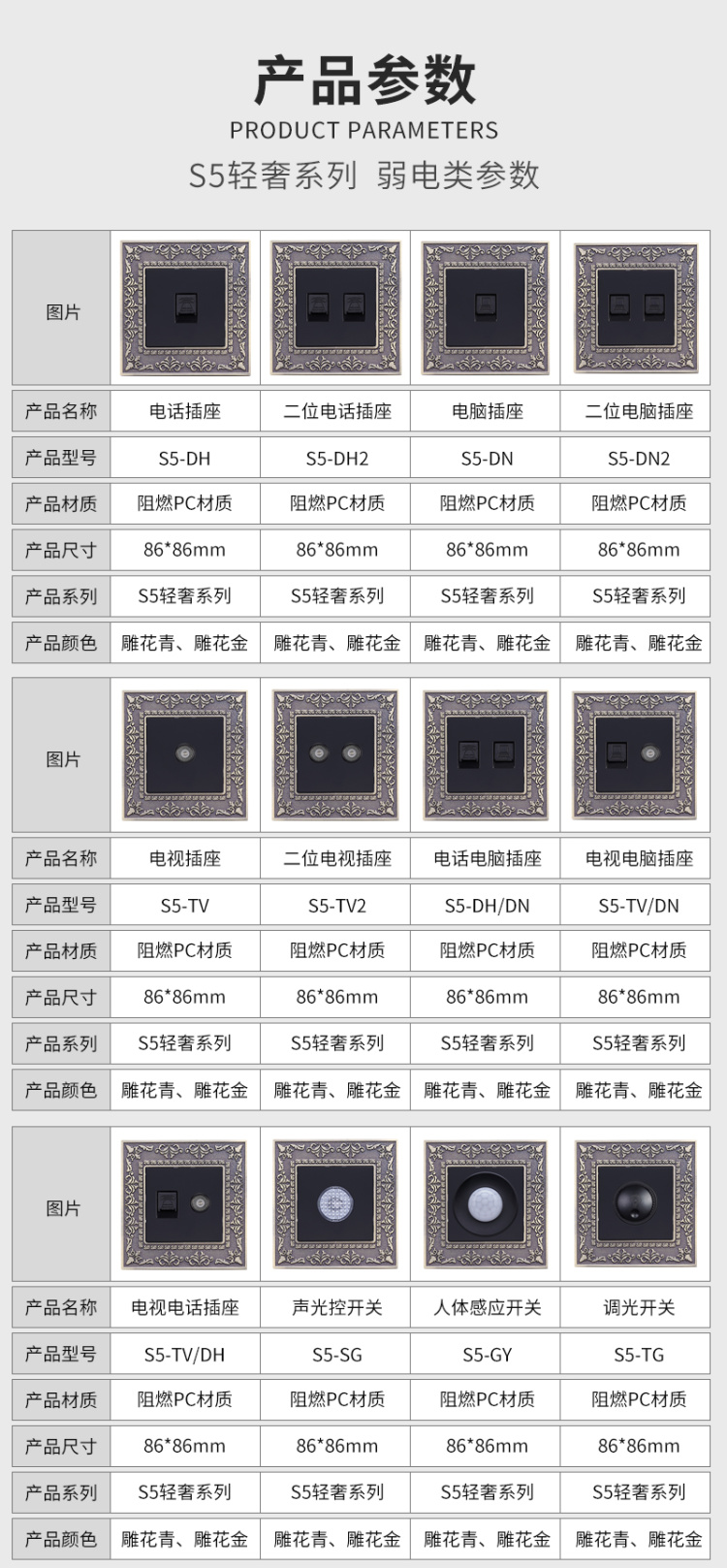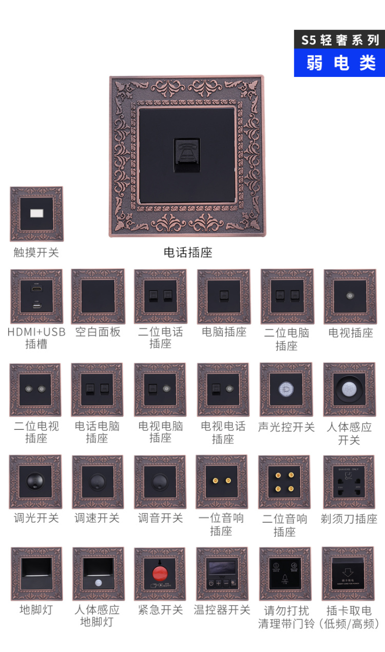 S5輕奢系列(雕花)-弱電類開關(guān)插座